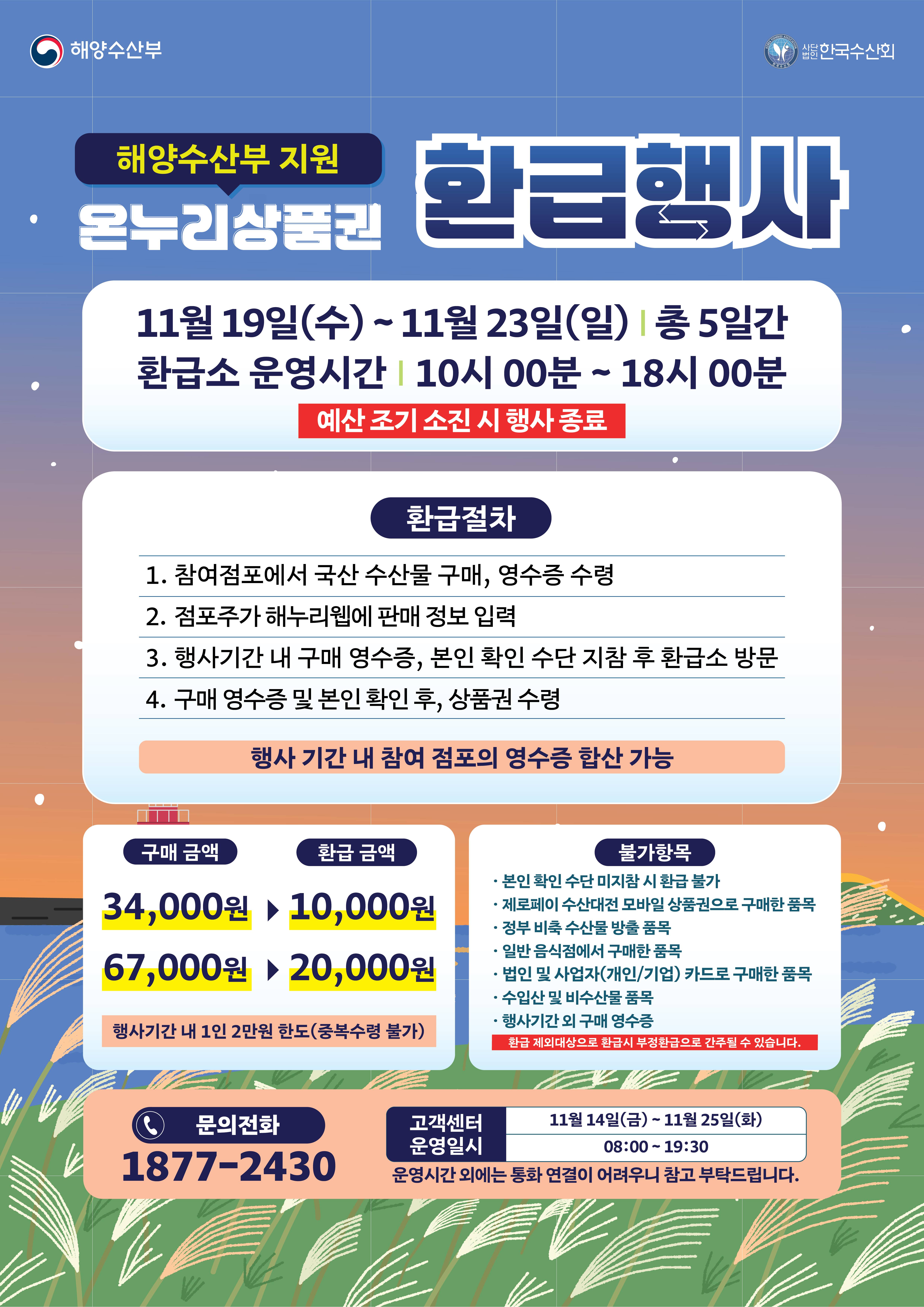 - 내용: 경기침체 및 수산물 거래 활성화 도모를 위한 해양수산부 지원 온누리상품권 환급행사(34,000원 이상(1만원 환급), 68,000원 이상(2만원 환급))